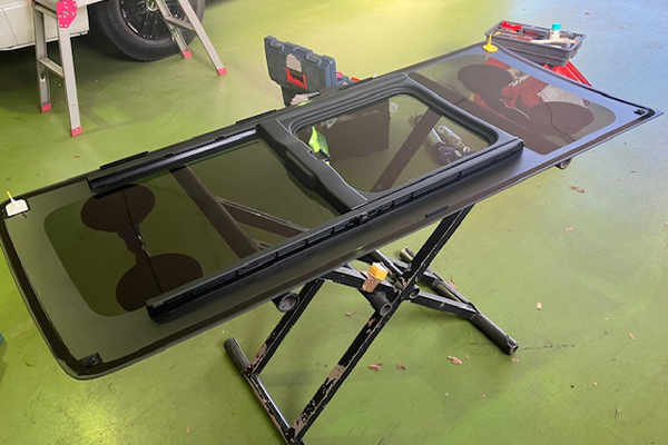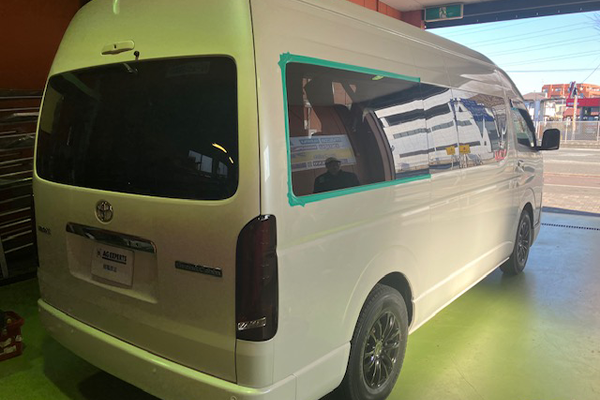 ハイエース特殊車両にて右側後部サイドガラスが一枚もので喚起等不便な事から小窓付タイプのガラスに変更したくご来店頂きました。お客様のこだわりがつまったお車だけに交換後大変満足して頂けました。本日はご来店頂きありがとうございました。