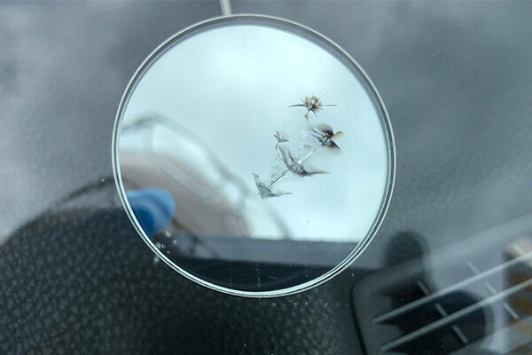飛び石でご来店され確認させていただきました。フロントガラス表面に打点が3か所ありましたのでガラス交換をお勧めしましたが、ユーザー様のご要望により、リペアで対応。仕上りについてもご納得いただき納車させていただきました。この度はご来店ありがとうございました。
