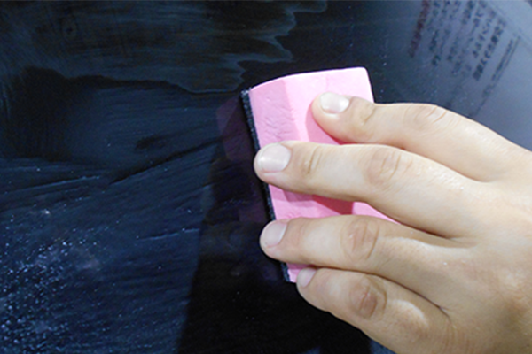 ガラスの汚れを落とした後、手始めに手磨きで施工してみます。専用ナイロンパッドに磨き革命を適量塗布します。