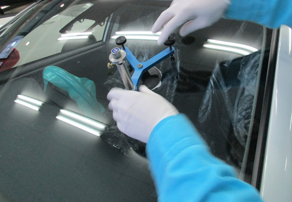 ボディを保護できるように養生し、まずは下準備としてガラスの傷口にドリルで穴を空けてレジンを注入しやすくします。その後、インジェクターという器具をフロントガラスにセットします。
